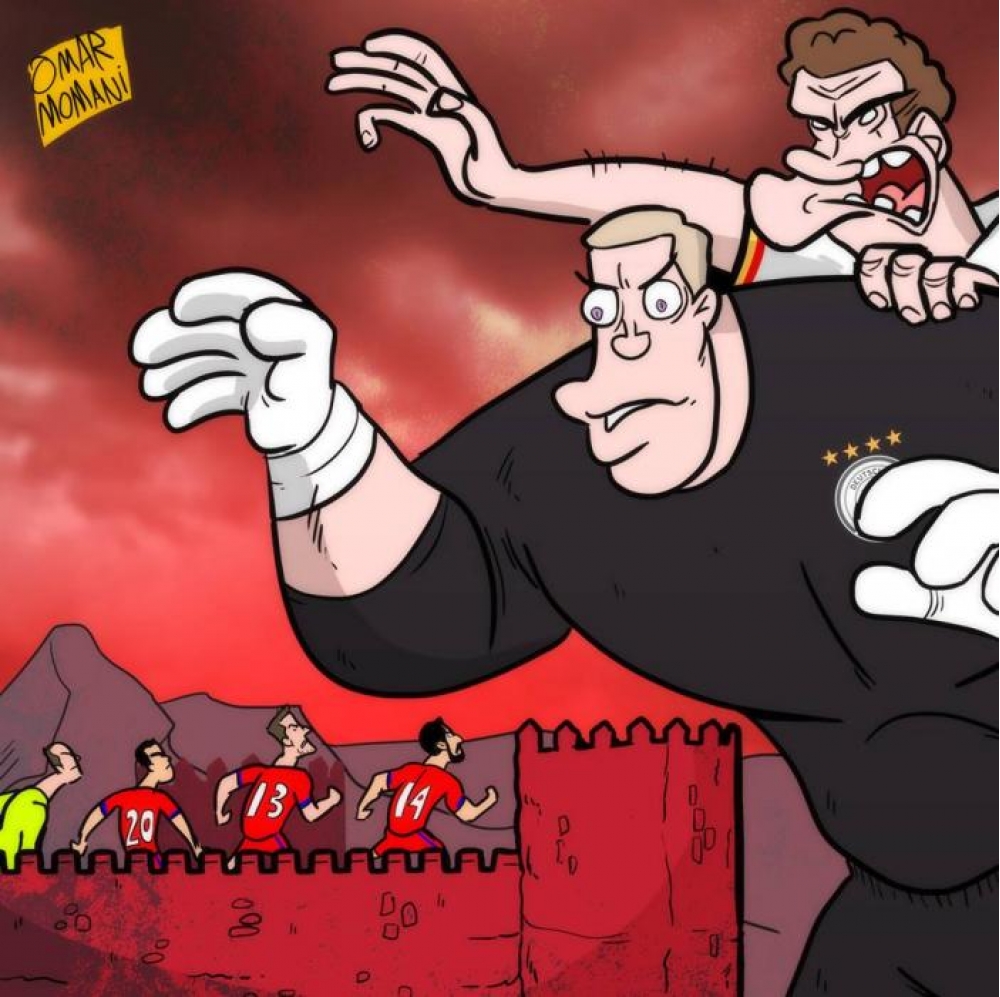 Karikaturaçı Omar Momani bu dəfə Azərbaycan - Almaniya görüşünü əks etdirən karikatura hazırlayıb. SportLine.az xəbər verir ki, Momani karikaturaya "Niyə də Azərbaycan yox?" adını qoyub. Sosial şəbəkədə paylaşdığı əsərdə Momani belə bir sual da qoyub: “Norveç üzərindəki qələbədən sonra Azərbaycan dünya çempionları ilə oyunda da uğur qazana biləcək?”