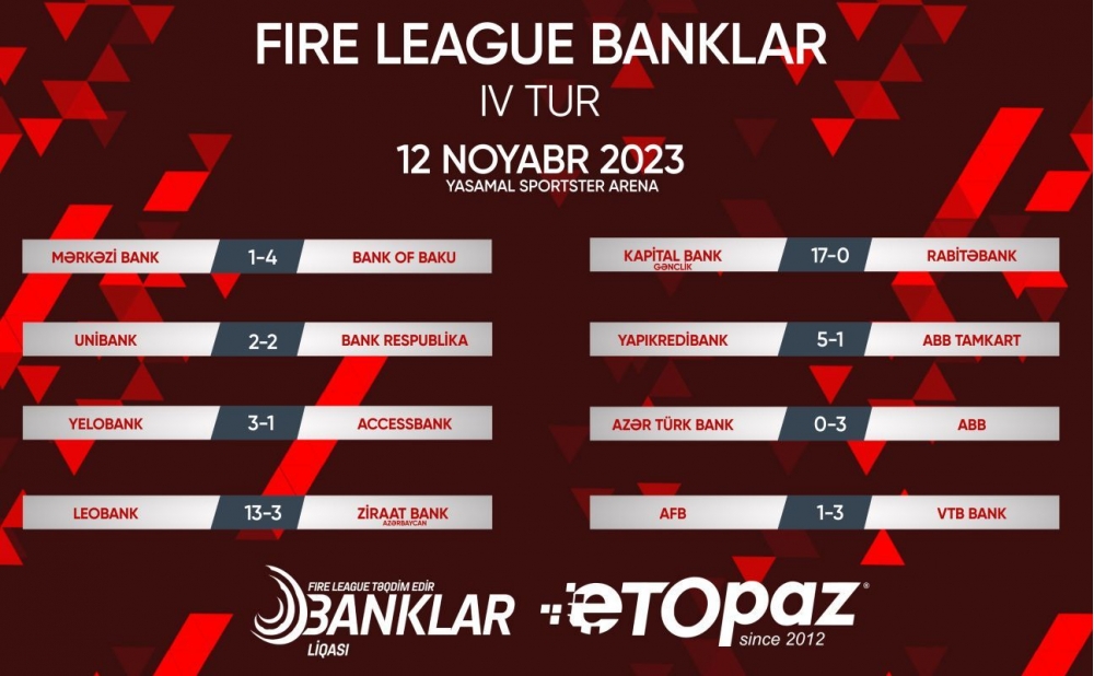 ETOPAZ”-ın baş sponsorluğu ilə keçirilən “Fire League Banklar” minifutbol turnirində 4-cü turun oyunlarına yekun vurulub.