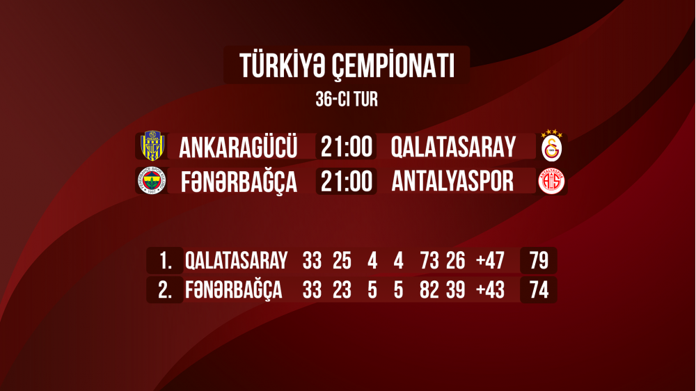 Bu turda çempionun adına aydınlıq gələ bilər. Bu titul üçün “Qalatasaray”a qələbə kifayət edir. "Aslanlar" "Ankaragücü"nü məğlub etsələr, vaxtından əvvəl çempionluğu rəsmiləşdirəcəklər.