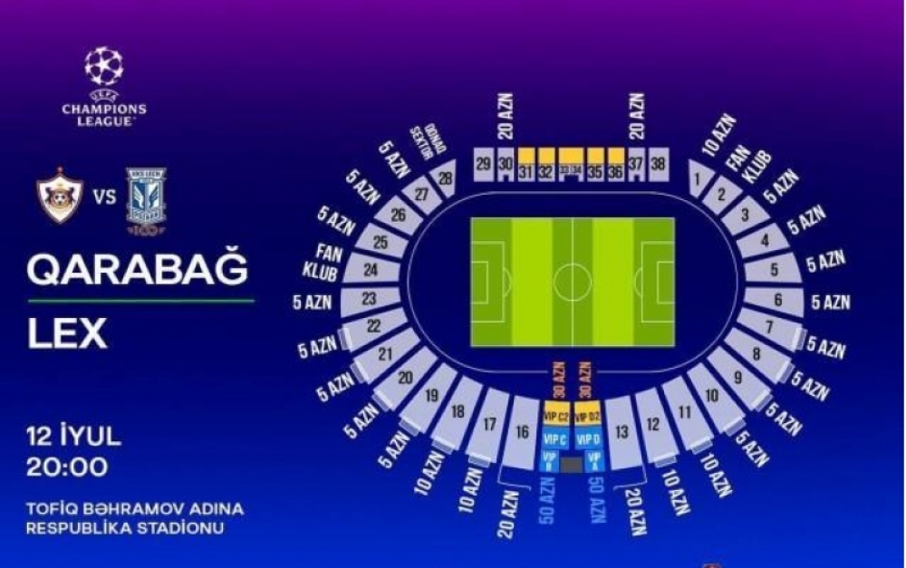 "Qarabağ"ın Çempionlar Liqasının 1-ci təsnifat mərhələsində "Lex"lə (Poznan, Polşa) Tofiq Bəhramov adına Respublika Stadionunda keçirəcəyi ev oyununa bilet satışı davam edir.
