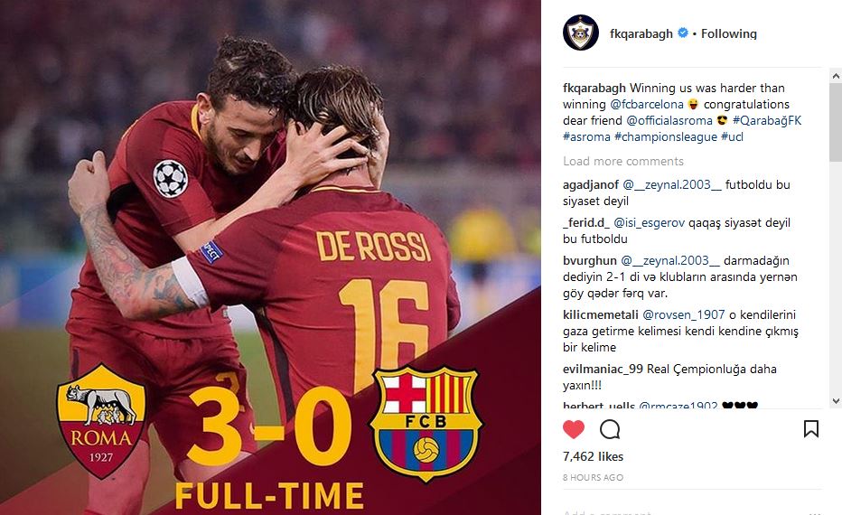 "Qarabağ" Futbol Klubunun rəsmi "Instagram" hesabı Çempionlar Liqasının 1/4 final mərhələsi çərçivəsində keçirilən "Roma" - "Barselona" görüşünə münasibət bildirib.