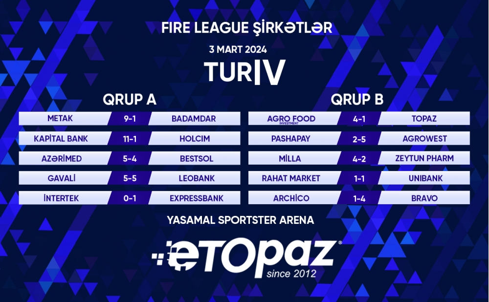 ETOPAZ-ın baş sponsorluğu , Fire League-nın təşkilatçılığı ilə keçirliən şirkətlər liqasında 4-cü turun oyunları baş tutub.